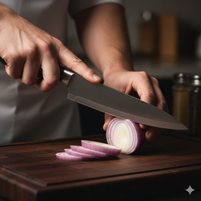 The “Claw”: With your other hand, tuck your fingertips inward to hold the food. Use your knuckles as a guide for the blade to ensure safety.