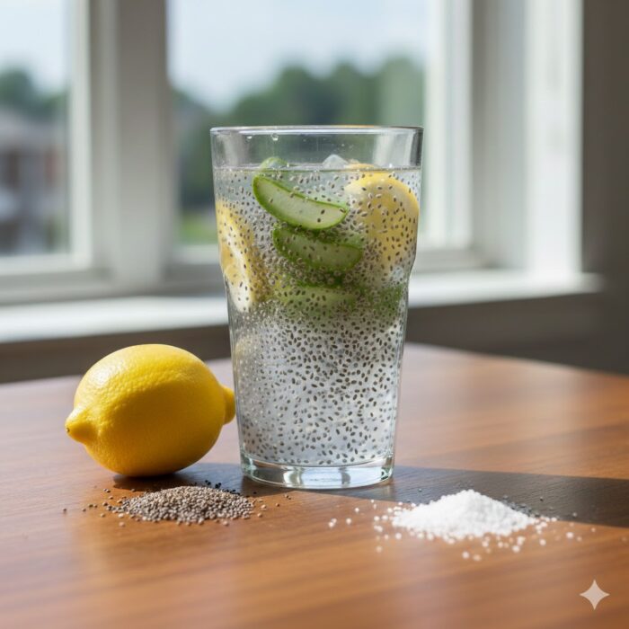 Combine: Add water, chia seeds, lemon, and aloe vera juice to a tall glass.